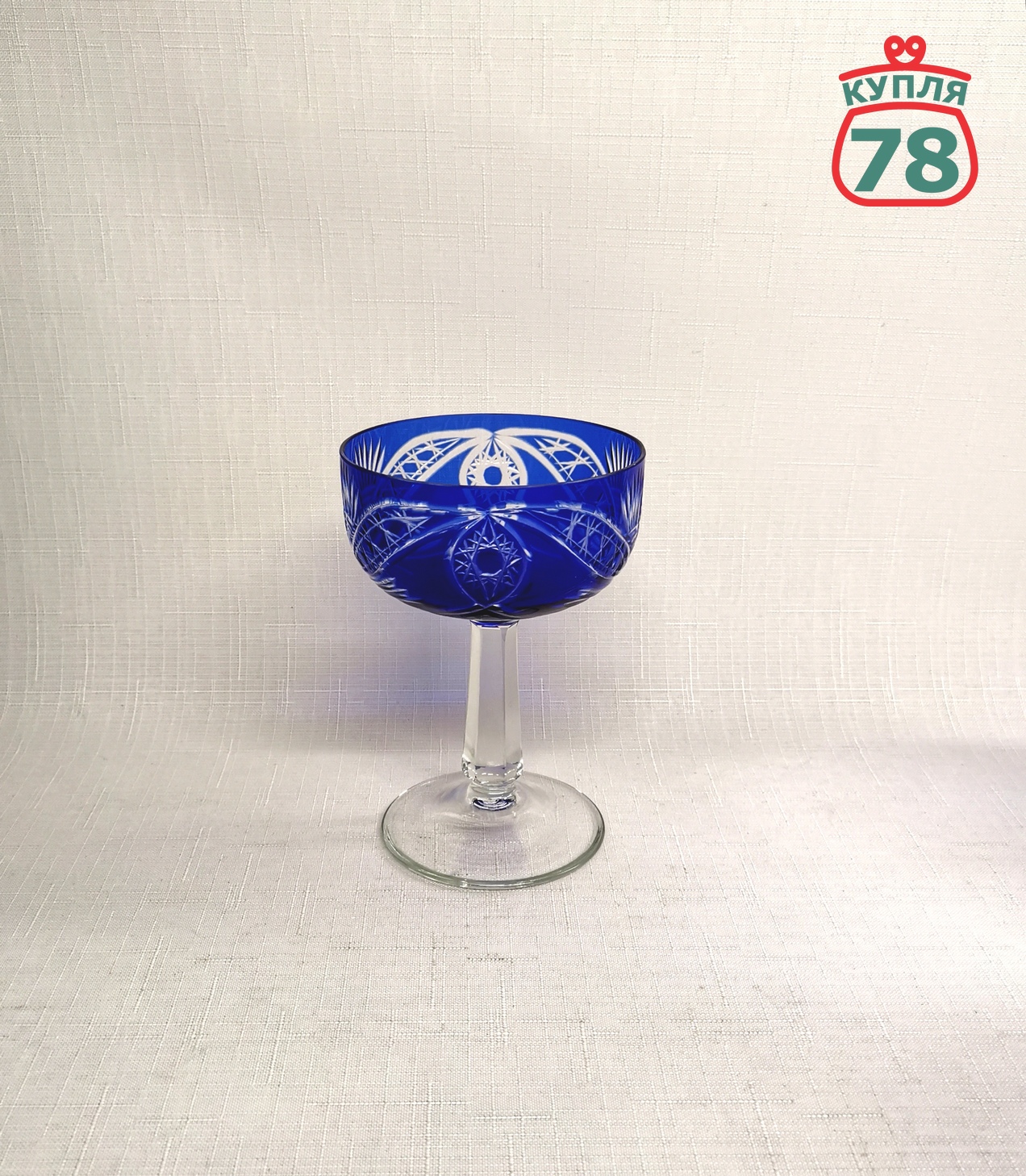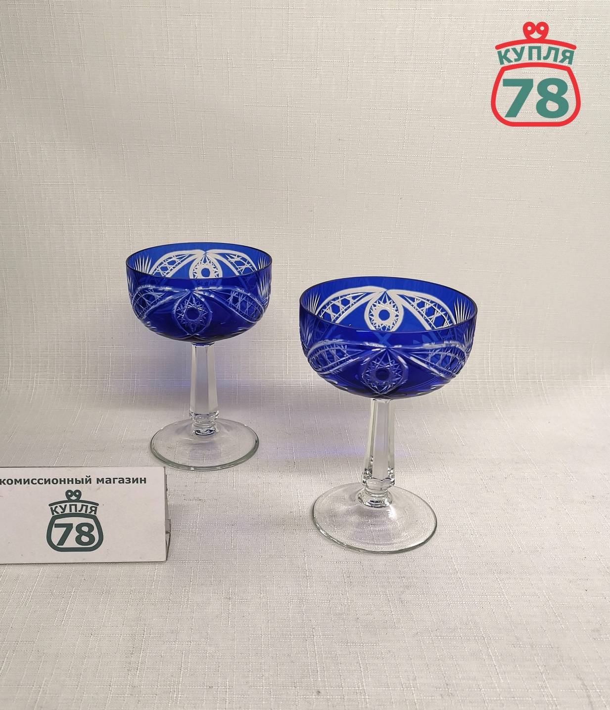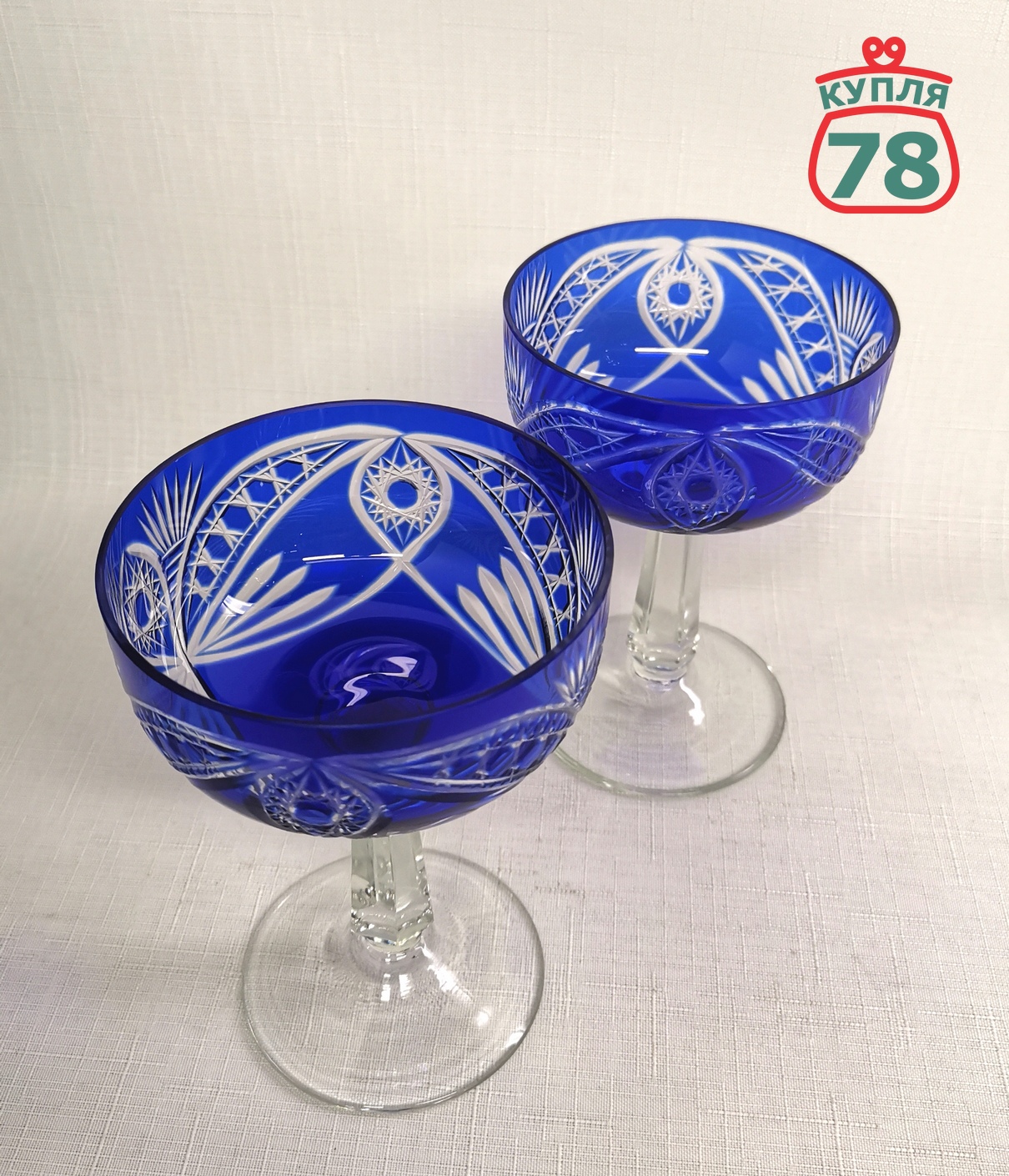 Описание товара: Широкие бокалы для шампанского и мартини (coupe). Кобальтовый двухслойный хрусталь, СССР 60-е годы. Высота 13 см, раскрыте 8,5 см. Состояние новых, сколов и трещин не обнаружено. Цена за 2 шт