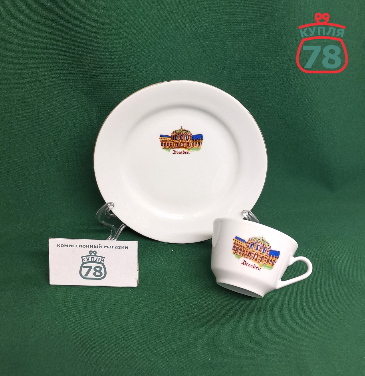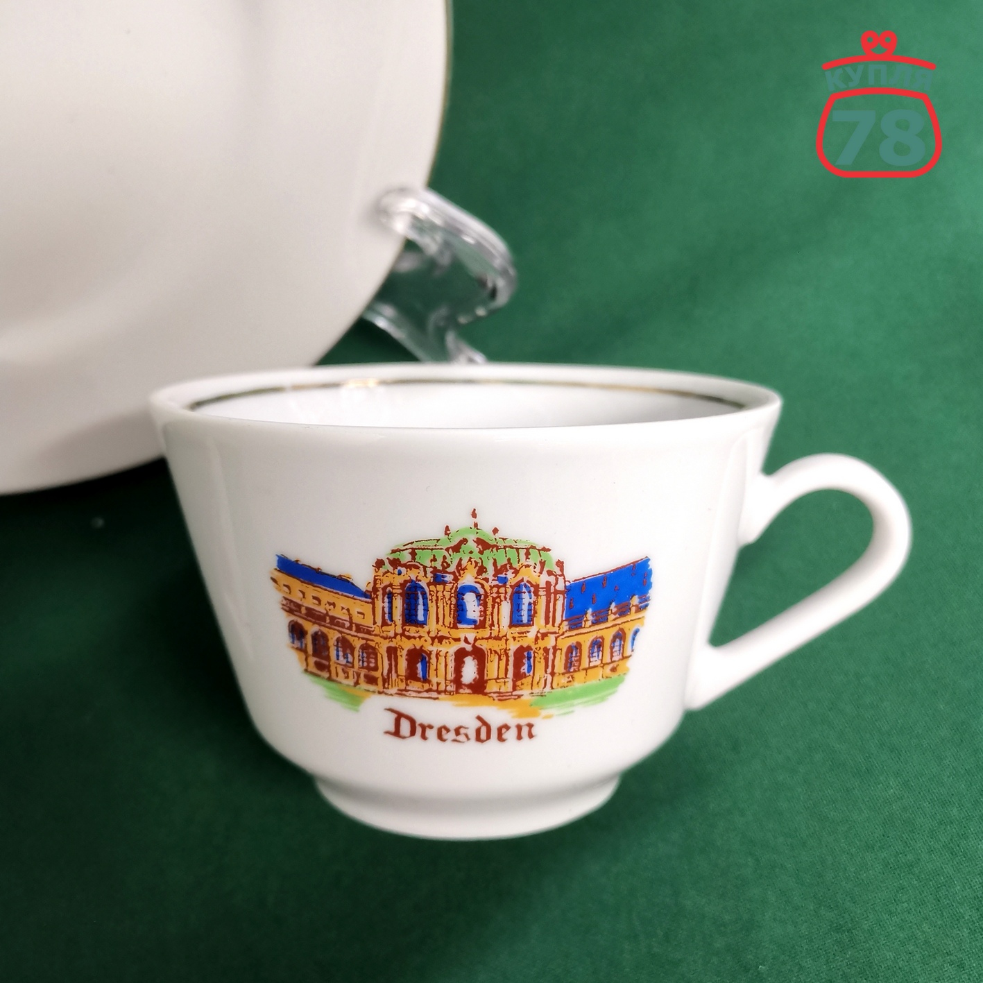 Описание товара: Набор сувенирный подарочный чайная чашка и десертная тарелка с надписью Dresden. Блюдце отсутствует. Диаметр тарелки 19 см, объём чашки 200 мл. Состояние новой, сколов, потёртостей и трещин не обнаружено. Цена за 2 предмета.