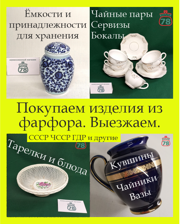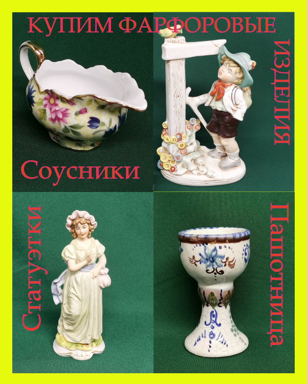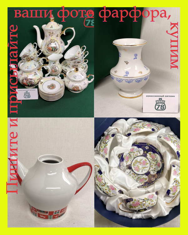Присылайте фото вашего фарфора. Фото нужны общее, клеймо, детали, нюансы. Любые изделия из фарфора рассмотрим, ответим, договоримся, приедем к вам. Также покупаем другие старые вещи СССР, ЧССР, ГДР, ПОЛЬШИ, КИТАЙ, АНГЛИЯ, ЯПОНИЯ и другие.