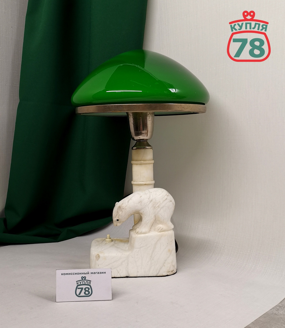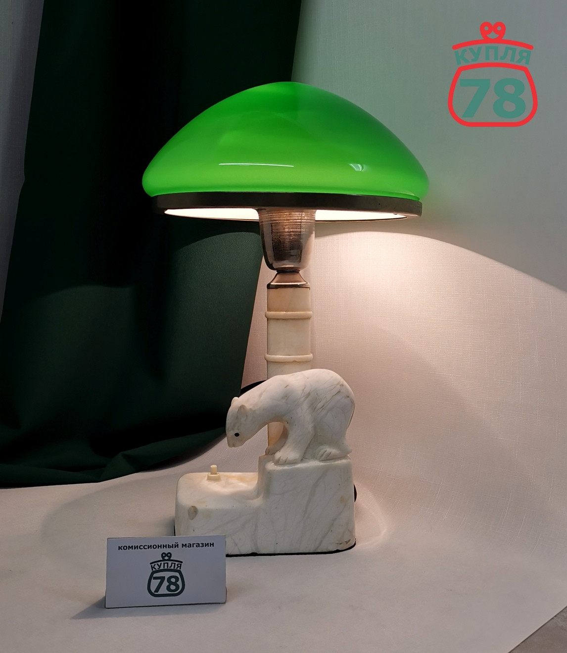 Описание товара: Настольная мраморная лампа СССР выпуск 50-х годов. Очень хорошая сохранность, фигурка медведя без повреждений, рабочая, плафон из двухслойного стекла без сколов и трещин. Высота лампы 45 см. На два патрона Е27.
