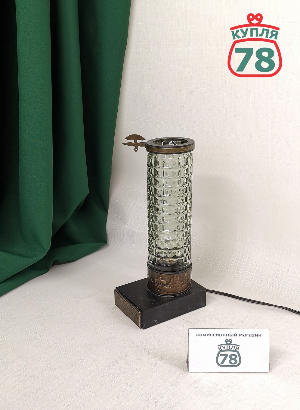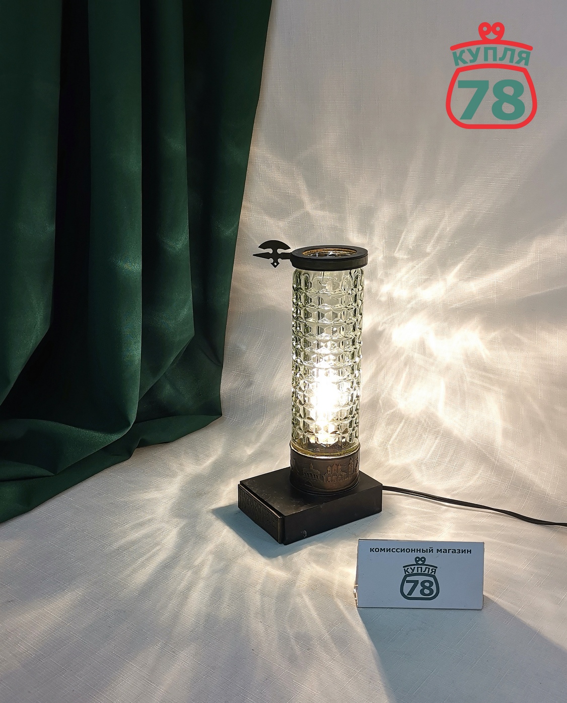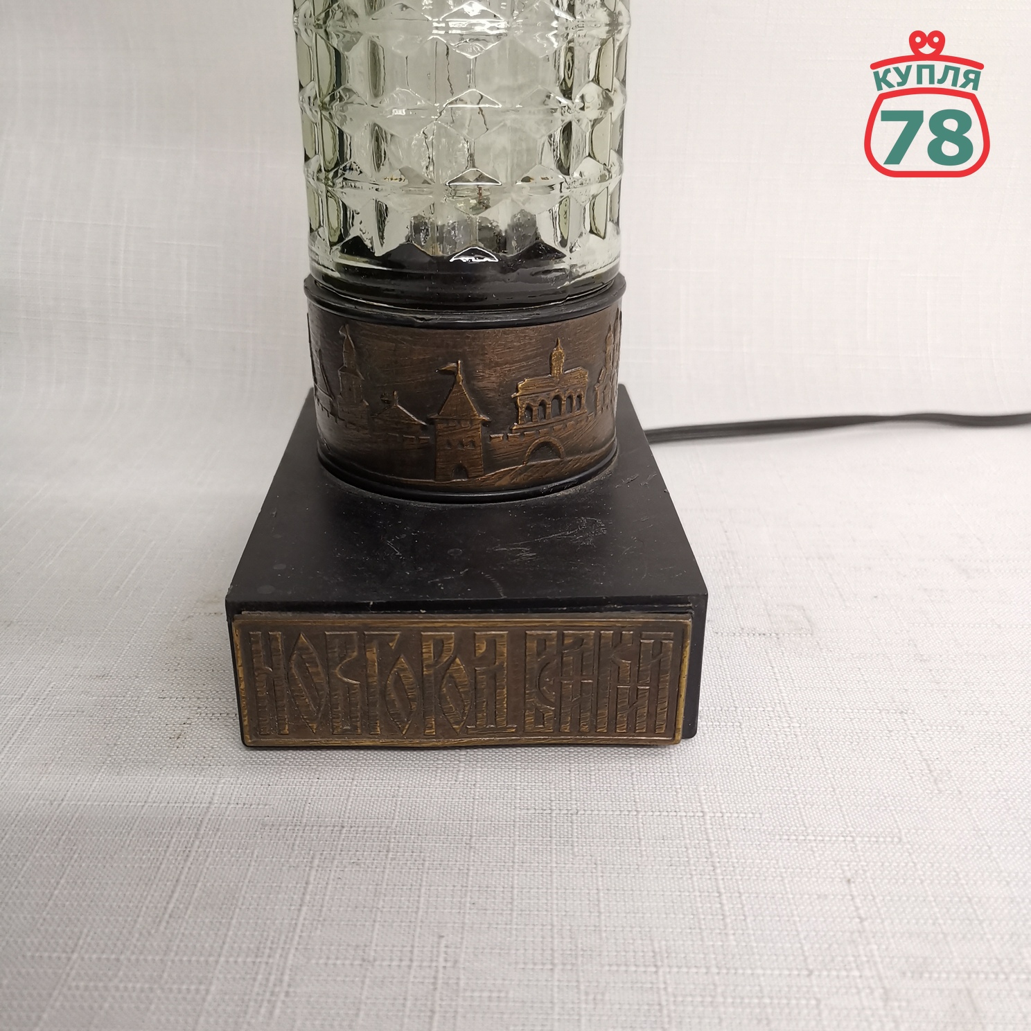 Описание товара: Сувенирная настольная лампа или ночник «Новгород великий». В рабочем состоянии. Патрон Е14. Выключатель на кабеле. стеклянная вставка без трещин и сколов.