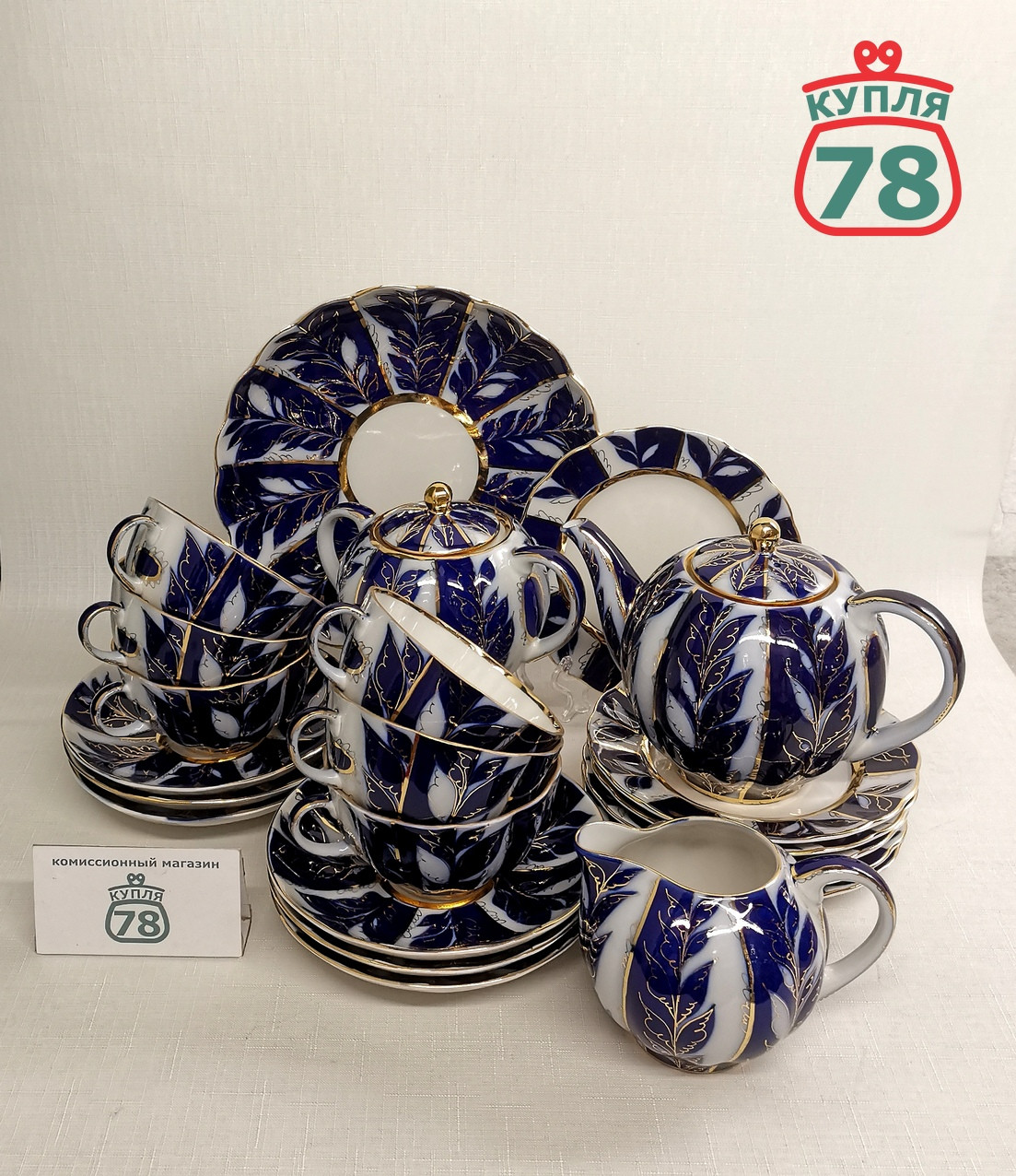 Описание товара: Чайный сервиз полный в состоянии нового, без следов использования. В составе: 6 чайных пар, 6 десертных тарелок, сухарница, заварочный чайник, сахарница, молочник. Сколов и трещин не обнаружено.