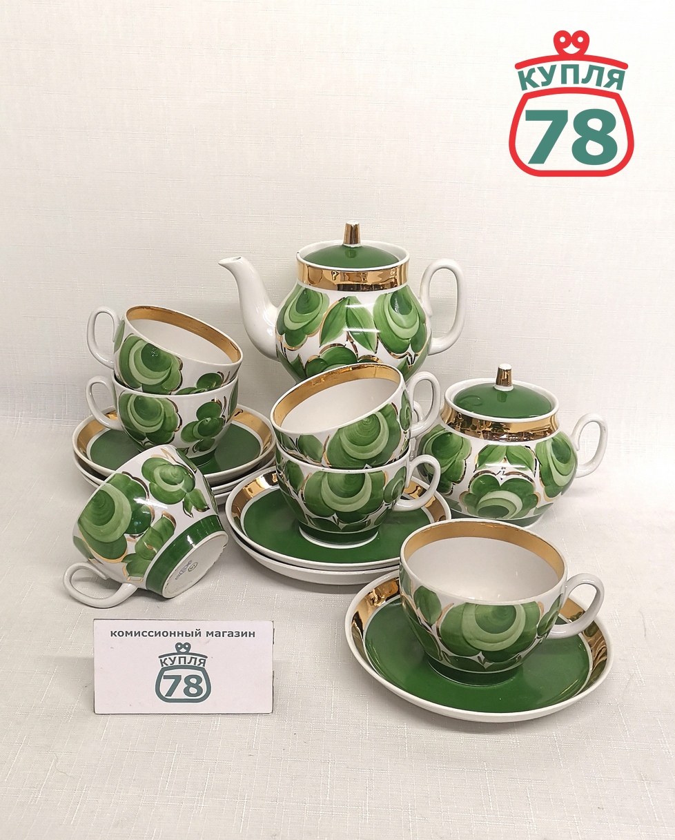 Описание товара: Сервиз в отличном состоянии, позолота без потёртостей, сколов и трещин не обнаружено. В составе 6 чайных пар, сахарница, чайник.