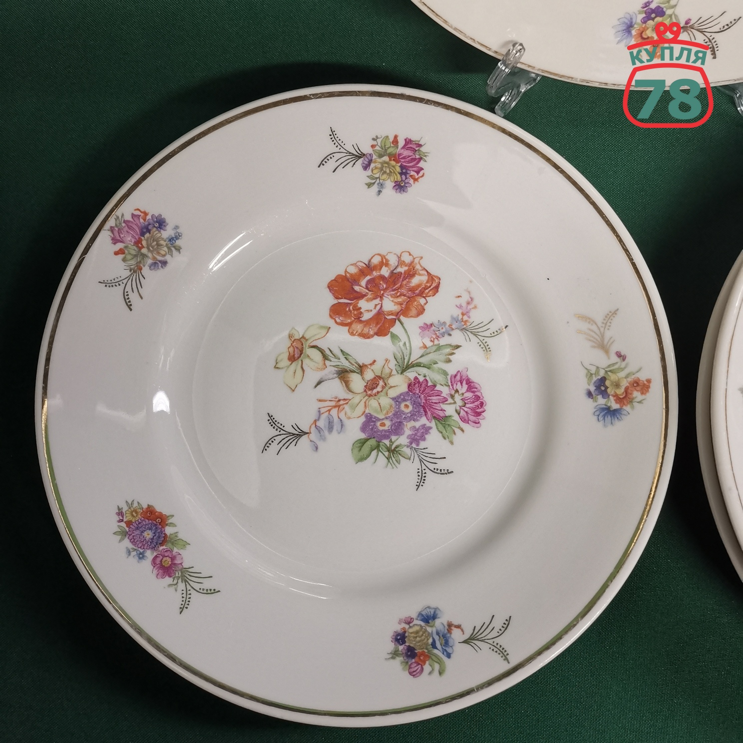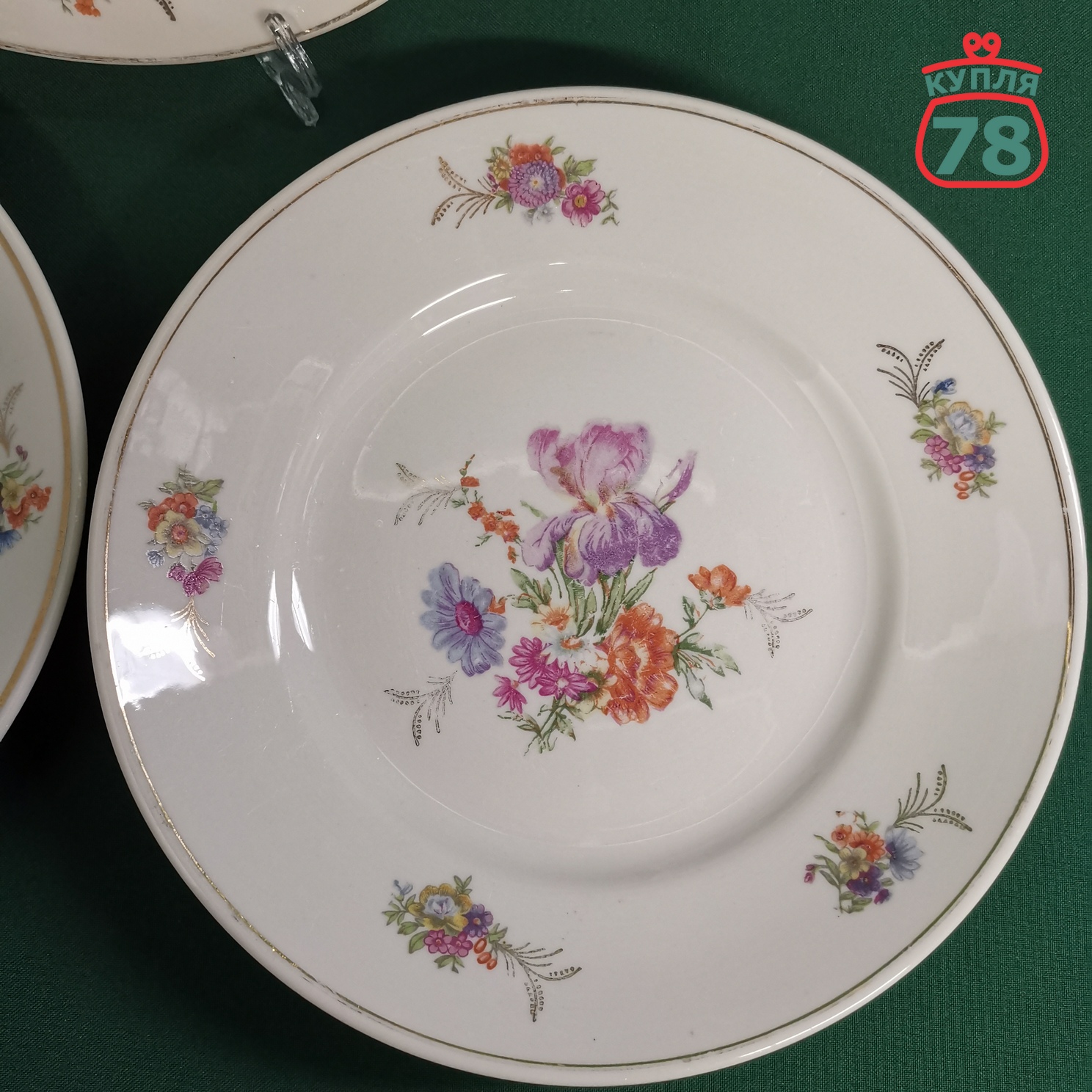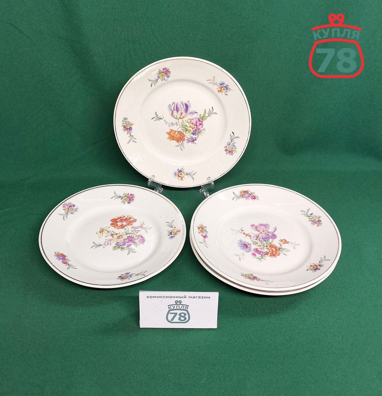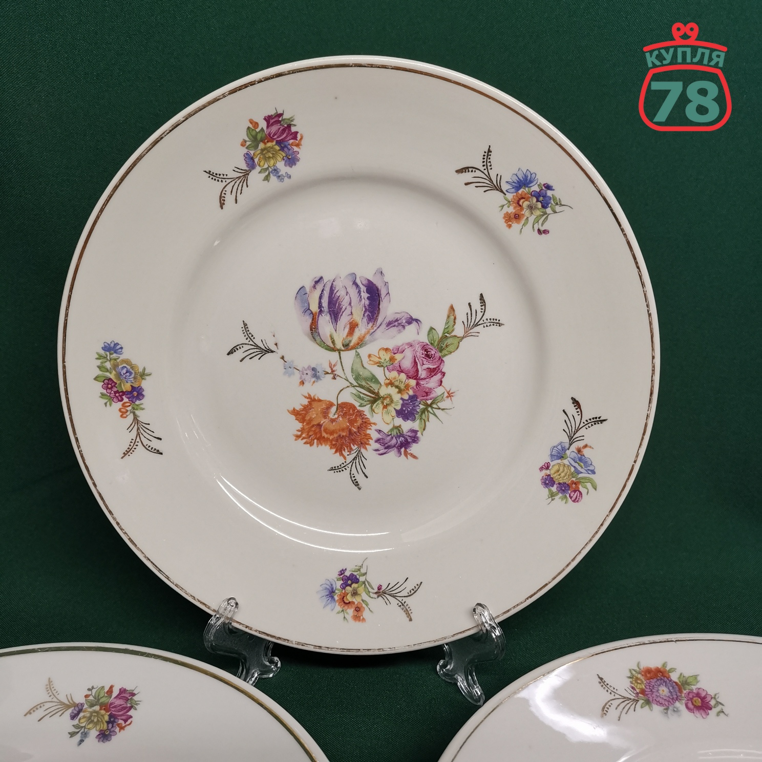Описание товара: Набор из четырёх винтажных тарелок производство завода Пролетарий 50-е годы. Отличная сохранность. Сколов и трещин не обнаружено. Диаметр 20 см. Цена за 4 шт.